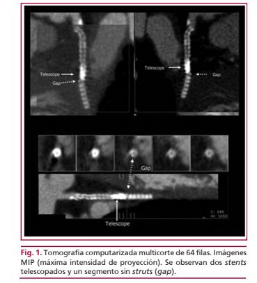 La fractura del stent es una complicación que se ha comunicado luego del implante de stents liberadores de sirolimus con una frecuencia que oscila entre el 1,9% y el 16% según las series y que se asocia con una tasa mayor de reestenosis y de eventos cardíacos a largo plazo. En esta presentación se describe el caso de un paciente en el que, casi 6 años después del implante de dos stents liberadores de sirolimus telescopados, a través de tomografia computarizada multidetector y angiografía invasiva se evidenció la fractura de los stents telescopados, asociada con oclusión del stent.