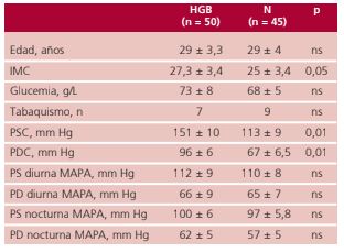 Material y métodos: Estudio prospectivo en el que se incluyeron 95 primigestas en la semana 20 de gestación, 50 con HGB y 45 normotensas como grupo control. Se registraron laboratorio de rutina, presión de consultorio y MAPA en la inclusión y a las 32 semanas de gestación. La hipertensión matinal y el comportamiento non-dipper se evaluaron por MAPA.
