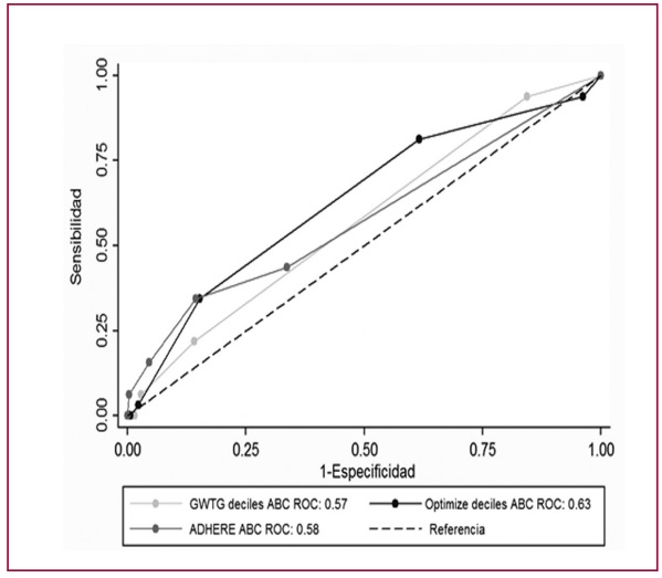 Resultados: Se calculó el resultado de las escalas en 379 pacientes, de los cuales el 54% eran mujeres; la mediana de edad fue de 75 años, el 79% eran hipertensos y el 24% eran diabéticos. El área bajo la curva del OPTIMIZE-HF fue de 0,63 (IC 95%0,53-0,73), la del GWTG-HF fue de 0,57 (IC 95% 0,49-0,65) y la del ADHERE fue de 0,58 (IC 95% 0,47-0,68).