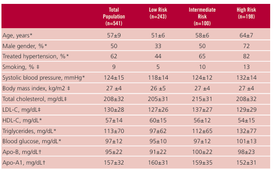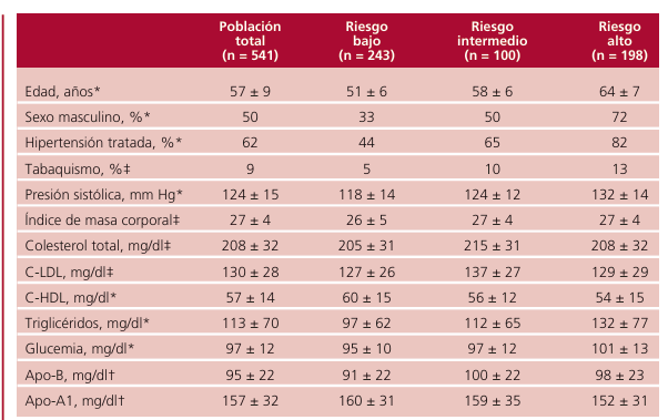 Resultados: Se analizaron 541 pacientes, de los cuales 243 (45%) se estratificaron de riesgo bajo, 100 (18%) de riesgo intermedio y 198 (37%) de riesgo alto. La prevalencia de placa (aterosclerosis subclínica) fue del 12% (IC 95% 9-17) en el grupo de riesgo bajo, del 23% (IC 95% 16-32) en el de riesgo intermedio y del 41% (IC 95% 34-48) en el grupo de riesgo alto (p < 0,001). Al analizar los diferentes subgrupos, en los pacientes de riesgo intermedio con dos o más factores de riesgo se observó una prevalencia de aterosclerosis subclínica del 30% (IC 95% 20-43); en cambio, en el subgrupo con 0 a 1 factor de riesgo, la prevalencia fue del 14% (IC 95% 6-27) (p < 0,05).