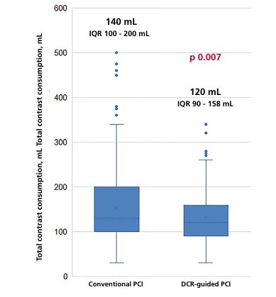 Resultados: El grupo DCR presentó una reducción significativa en el volumen de contraste utilizado en comparación con el grupo control: mediana (rango intercuartílico, RIC) de 120 ml (90-158) vs. 140 ml (100-200), p=0,007. La reducción promedio, ajustada por edad, sexo y complejidad del procedimiento, fue de 37,3 ml por paciente (IC95% 24,3 a 50,5 ml; p<0,001). No se observaron diferencias significativas en la función renal post procedimiento ni en la exposición a radiación.