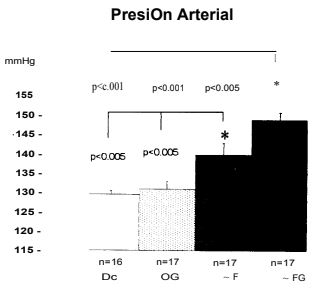 Una dieta enriquecida en fructosa es capaz de producir hipertensión arterial en la rata. El objetivo de este trabajo fue potenciar las alteraciones glucolipídicas que acompañan este proceso y estudiar su impacto sobre la presi6n arterial (PA). Las ratas se dividieron en cuatro grupos segun la dieta: C, dieta estandar; G, glicerol a15% en la bebida; F, 55% de fructosa en reemplazo de la dextrina y FG, la misma dieta que F y glicerol al 5%. Al final de dos semanas los valores de PA fueron mayores en el grupo F con respecto al C y en el FG con respecto a ambos. La insulinemia se vio incrementada en el grupo FG con respecto a los otros tres grupos. La trigliceridemia fue superior en los tres grupos experimentales (G, F y FG) con respecto al control. Los anillos de aorta mostraron una ED50 menor al forbol 12,13-dibutirato (PDBu) en FG con respecto al C, con una correlación positiva ED 50 PDBu/PA: r = 0,69 (r 2 = 0,48). Se concluye que la administración de glicerol a ratas alimentadas con una dieta rica en fructosa potencia el desarrollo de HTA. Además, las correlaciones positivas entre la sensibilidad PDBI.t y la insulinemia por un lado y la PA por el otro, sugieren la participación de la proteinquinasa C (PKC) entre los mecanismos que conducen a las alteraciones que se desarrollan en estos parámetros.