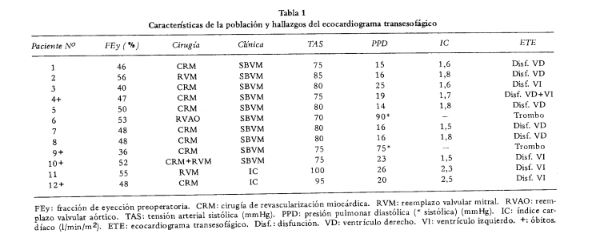 La factibilidad, seguridad y utilidad clínica del ecocardiograma transesofágico fueron evaluadas en 12 pacientes consecutivos sometidos a cirugía cardiovascular, que presentaron inestabilidad hemodinámica grave, inesperada y persistente en el posoperatorio . Fueron excluidos todos aquellos con etiología claramente evidenciable (alteraciones del laboratorio, infarto perioperatorio, taponamiento cardiaco, taquiarritmias) . En todos los casos se realizo en la sala de recuperación de cirugía cardiovascular un estudio ecocardiográfico transtorácico con Doppler e inmediatamente después uno transesofágico . Las pruebas fueron realizadas dentro de las primeras 72 horas del posoperatorio en el 83 % de los pacientes . En todos el estudio transtorácico fue inadecuado para detectar el mecanismo involucrado en la falla hemodinámica . El hallazgo mas frecuente del ecocardiograma transesofágico fue la disfunción ventricular, siendo el ventrículo derecho la cámara involucrada en 5 casos y el ventrículo izquierdo en 4 . Solo en 1 paciente se encontraban comprometidas ambas cavidades ventriculares en forma simultánea . En otros 2 casos se detectó importante trombosis de vena cava superior como causa de tromboembolismo de pulmón . No se presentaron complicaciones referidas al estudio . Concluimos que el ecocardiograma transesofágico resultó un procedimiento diagnóstico sencillo de implementar en la sala de recuperación de cirugía cardiovascular, libre de complicaciones mayores y que brindo un importante caudal de información acerca del fallo hemodinámico luego de la cirugía cardíaca .