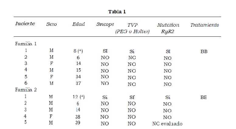 La taquicardia ventricular polimórfica y la fibrilación ventricular son infrecuentes en ausencia de cardiopatía estructural, pero de gran relevancia clínica por su morbimortalidad elevada (síncope y/o muerte súbita) si no se diagnostican y tratan adecuadamente. En este trabajo se muestran los resultados de la evaluación clínica y del análisis genético de 11 sujetos pertenecientes a dos familias: 2 pacientes con síncope y taquicardia ventricular polimórfica inducida por ejercicio y 9 miembros familiares asintomáticos. A todos se les realizó un examen clínico, un electrocardiograma, una radiografía de tórax, Holter de 24 horas y prueba de esfuerzo. Diez fueron sometidos a estudio genético. Los 2 pacientes eran niños con síncope recurrente de 2 años de evolución, sin cardiopatía estructural y con intervalo QTc normal. El Holter de 24 horas mostró extrasistolia ventricular frecuente, bigeminada, duplas y taquicardia ventricular polimórfica durante la actividad física. La prueba de esfuerzo indujo taquicardia ventricular polimórfica. El estudio genético identificó mutaciones del gen que codifica el receptor de la ryanodina cardíaca (RyR2). Los 9 miembros familiares eran asintomáticos, no tenían cardiopatía estructural ni arritmia ventricular en el Holter de 24 horas o en la prueba de ejercicio. El estudio genético de los 8 sujetos evaluados no identificó mutaciones del gen RyR2. Los betabloqueantes previnieron o disminuyeron la frecuencia de los episodios sincopales y evitaron la muerte súbita durante el seguimiento de 40 meses en un paciente y de 14 en el otro. La taquicardia ventricular polimórfica catecolaminérgica debería considerarse en pacientes con sincope de esfuerzo, sin cardiopatía asociada y con intervalo QTc normal.