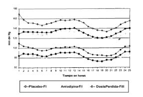 Se randomizaron 55 pacientes, 27 al grupo A y 28 pacientes al grupo B. Ambos grupos de tratamiento tuvieron características demográficas similares. Al concluir la fase de tratamiento activo las dos drogas produjeron reducciones significativas de la presión arterial respecto de la basal. Durante las primeras 24 horas del MAPA final se observó una reducción significativa de la presión arterial sistólica (PAS) y la PAD en ambos grupos de tratamiento aunque la reducción del grupo A fue mayor que la del B, -20,53/-14,11 mm Hg versus -14,50/9,00 mm Hg (p < 0,01), respectivamente. Durante el segundo día de monitoreo, la eficacia antihipertensiva del enalapril se perdió progresivamente y el promedio de las ultimas 8 horas fue similar al que se observó en la fase placebo. En el grupo de amlodipina, el efecto antihipertensivo se mantuvo y el promedio de las últimas 8 horas de monitoreo fue significativamente menor que el que se observó durante la administración de placebo (p < 0,01).