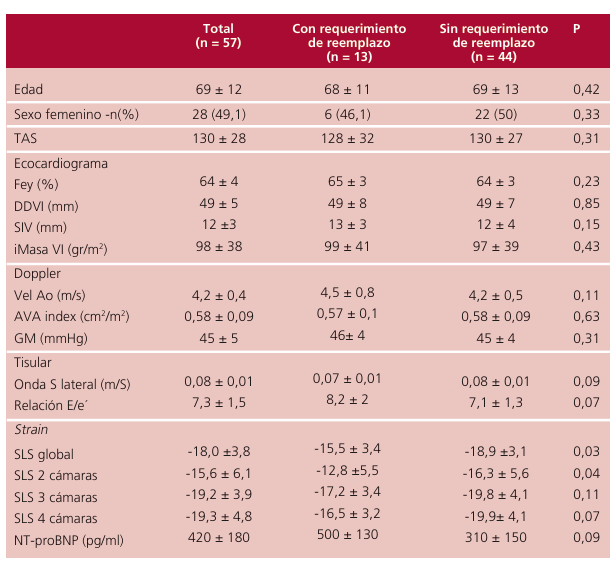 Materiales y métodos: Se seleccionaron pacientes con EAo grave y FE conservada que fueron considerados asintomáticos sin indicación inicial de RVA. A todos los pacientes se les realizó un ecocardiograma que evaluó el SLS de cada segmento en dos y tres y cuatro cámaras y el SLS global por el método VVI. Además, se realizó la medición del NT-proBNP. Se consideró como punto final el requerimiento de RVA.