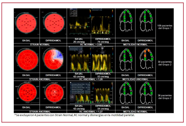 Análisis de la motilidad parietal posdipiridamol: el 96,46% del grupo 1 tenían motilidad parietal conservada y el 54,5% del grupo 2 (solo en 4 pacientes aumentó el strain apical).