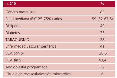 Resultados: Doscientos diez pacientes. El 83% eran hombres. La edad (mediana) alcanzó los 59 años (52-67,5). El 74,5% tuvo alta con atorvastatina a 40 mg/día; un 19%, con rosuvastatina a 20 mg/día; un 2,7%, con atorvastatina a 80 mg/día; y un 3,9%, con rosuvastatina a 40 mg/día. Un 50% de los pacientes continuaron tomando estatinas de alta intensidad, 28% redujeron la dosis y 22% abandonaron el tratamiento.
