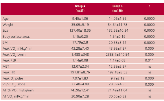 Resultados: Los grupos A y B son significativamente diferentes en edad, peso, talla y superficie corporal. Se encontraron diferencias significativas entre los dos grupos en VO2ml/min (p < 0,0000), cociente de intercambio respiratorio (p < 0,01), pulso de O2ml/lpm (p < 0,0000) y pendiente VE/VCO2 (p < 0,0000). En el análisis por sexo se encontraron diferencias significativas en VO2ml/kg/min pico, VO2ml/min pico, MET, pendiente VE/VCO2 y VO2