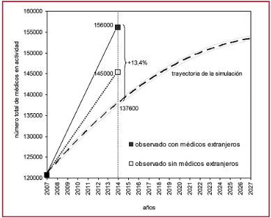 Resultados: La estimación hasta 2027 reveló un crecimiento del 27% de acuerdo con la proyección histórica de egresados universitar-ios. La validación prospectiva a los 7 años del inicio de la simulación mostró una subestimación del modelo del 13,4%, posiblemente debido a la incorporación de más médicos extranjeros.