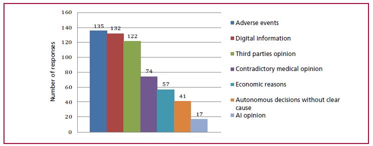 Resultados: El 40,9 % de los encuestados reportó rechazo reciente a estatinas. Los motivos principales fueron: eventos adversos (53,4 %) e influencia de información digital negativa (50,5 %). Otros factores incluyeron consejos de terceros, indicaciones médicas contrarias, motivos económicos y decisiones autónomas. El 74 % de los pacientes que rechazaron estatinas aceptaban otras terapias. El 66,6 % de los profesionales notó un aumento en esta tendencia.