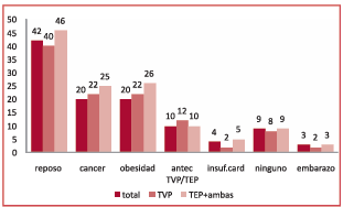 Conclusiones: El reposo prolongado fue el factor de riesgo más prevalente. Solo el 9% no evidenció factores de riesgo conocidos. La tomografía helicoidal fue el método más utilizado para el diagnóstico de TEP. La heparina de bajo peso molecular fue el tratamiento de elección de la ETEV. Los trombolíticos se emplearon en el 11% de las TEP y el filtro de la vena cava en el 12% de las ETEV. La mortalidad hospitalaria de la ETEV fue del 7%.