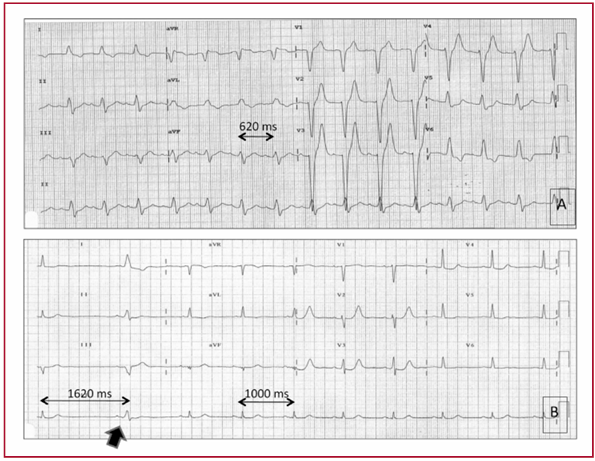 Los bloqueos de rama dependientes de la frecuencia suelen estar relacionados con el aumento de la frecuencia cardíaca (bloqueo de rama taquicárdico-dependiente o en fase 3). Menos comúnmente, son causados por la reducción de la frecuencia cardíaca (bloqueo de rama bradicárdico-dependiente o en fase 4). El bloqueo en fase 3 es la presentación más frecuente de los trastornos de la conducción intraventricular paroxísticos, documentada en varias publicaciones. Sin embargo, no son tan numerosos los artículos que describen el bloqueo de rama en fase 4 y, raras veces, ambos mecanismos coexisten en el mismo paciente. En esta presentación se describe el caso de un paciente ingresado con un infarto agudo de miocardio en el que se detectaron trastornos de la conducción intraventricular paroxísticos, tanto taquicárdico-dependientes como bradicárdico-dependientes.