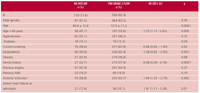 Conclusión: La edad avanzada, la localización anterior y la demora al tratamiento resultaron predictores clínicos independientes de no-reflujo. La confirmación de estos hallazgos en estudios prospectivos permitiría implementar estrategias para prevenir su aparición y, eventualmente, mejorar los resultados clínicos a largo plazo