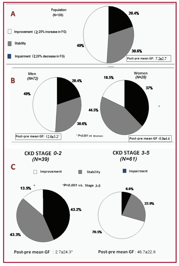 Se analizaron 100 pacientes, la mayoría de sexo masculino (72%), edad media de 67,3 ± 9,9 años, con múltiples factores de riesgo cardiovascular (HTA 95%, DLP 74%, TBQ 63%, DM 28%) y amplio compromiso vascular aterosclerótico (enfermedad coronaria 56%, enfermedad vascular periférica 39%). Se realizó angioplastia con stent en el 98% de los casos, el 22% en forma bilateral, con un éxito del 99%. Se observó un descenso significativo de la tensión arterial sistólica (TAS) en el seguimiento alejado (TAS preprocedimiento 139,7 ± 24,2 mm Hg - TAS posprocedimiento 129,7 ± 13,9 mm Hg; p < 0,05), así como una reducción del número de drogas indicadas (2,8 ± 1,03 - 1,7 ± 0,9; p = 0,02). Estos resultados beneficiosos fueron incluso mayores en pacientes con compromiso bilateral. En relación con la función renal, el 49% de los pacientes evidenciaron una mejoría sostenida (depuración de creatinina: 53,6 ± 18,4 ml/min basal vs. 60,8 ± 19,5 ml/min al seguimiento; p = 0,011), mientras que el 20,4% presentó un deterioro importante en el filtrado glomerular. La mejoría en el filtrado glomerular fue más frecuente en pacientes con deterioro crónico avanzado (70,5% estadios ≥ III vs. 13,5% estadios 0-II; p = 0,01) y con angioplastia renal bilateral (depuración de creatinina: 52,8 ± 25,3 ml/min basal vs. 66,1 ± 15,1 ml/min al seguimiento; p = 0,032). En el análisis multivariado, la enfermedad renal grado ≥ III (OR 29,6, IC 95% 8,3-105,8; p > 0,001) y el sexo masculino (OR 16,2, IC 95% 4,3-105,8; p > 0,001) fueron predictores independientes de mejoría del filtrado glomerular en el seguimiento.
