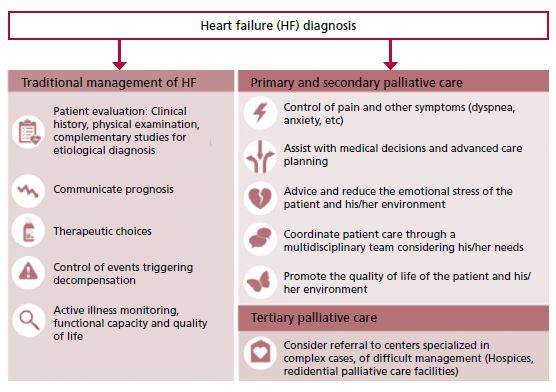 La insuficiencia cardíaca (IC) es una enfermedad crónica, compleja y progresiva, con elevada morbimortalidad y creciente prevalencia. Pese al avance en las estrategias terapéuticas, destinadas a mejorar la sobrevida y reducir hospitalizaciones, la IC continúa generando un impacto negativo en la calidad de vida de los pacientes. Surge ante este reto la necesidad de desarrollar políticas de salud basadas no solo en la integridad física, sino también en la integridad psicosocial. Los cuidados paliativos (CP) hacen referencia a un cuidado especializado, interdisciplinario, enfocado en mejorar y mantener la calidad de vida de los pacientes que se enfrentan a una enfermedad con elevada morbimortalidad como lo es la IC. El propósito de la presente revisión es evaluar el impacto de la integración de los CP en el tratamiento multidisciplinario de la IC en todas las fases de la enfermedad y determinar la factibilidad de su aplicación en la práctica clínica.