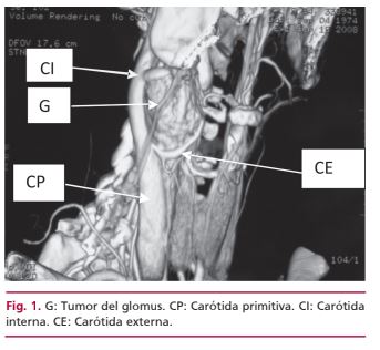 Los tumores del glomus carotídeo se caracterizan por su vascularización importante y su manejo preoperatorio puede incluir la embolización percutánea previa a la resección quirúrgica. Esta técnica disminuye la hemorragia y el tamaño del tumor y hace menos riesgosa la disección, con reducción de la morbimortalidad. Una técnica alternativa es la interrupción de la irrigación del tumor mediante la colocación de un stent cubierto en la carótida externa, que es la vía principal de irrigación. Esta técnica es útil en especial en tumores grandes y evita el riesgo de embolia intracraneal cuando se emplean coils para realizar la embolización. En esta presentación se describe el caso de una paciente de 31 años tratada de esta manera; se le colocó el stent y 24 horas después se realizó la resección del tumor.