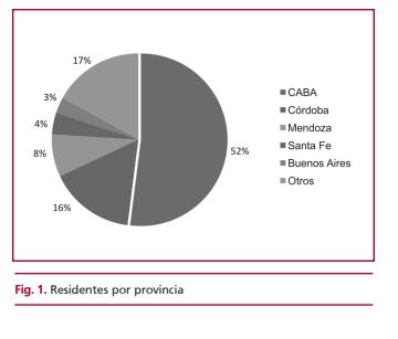 La edad promedio fue de 28 años, el 58% eran hombres, el 81% solteros y el 15% tenía al menos un hijo. El 55% realizaba su residencia en centros de Capital Federal y el 77% en centros privados, de los cuales el 86% tenían sala de hemodinamia y cirugía cardiovascular. El promedio de residentes por centro fue de 8, el 83% tenía jefe de residentes, el 55% instructor de residentes y el 44% tenía un médico de guardia activa. La cantidad de guardias promedio por mes fue de 7; el 50% de los residentes se encontraban en 3.°/4.° año y sólo el 4% tenía horario reducido posguardia. En cuanto a la formación académica semanal, el 77% tenía ateneos clínicos, el 82% clases teóricas y el 56% ateneos bibliográficos. En el aspecto laboral, en cuanto a su relación contractual, el 60% se encontraba con una beca, el 56% recibía una obra social, el 66% tenía una aseguradora de trabajo y el 63% debía realizar un trabajo extrarresidencia para poder mantenerse económicamente. El 33% trabajaba ≥ 80 horas/semana y el 36% dormía ≤ 35 horas/semana. El 55% refirió sentirse frecuentemente defraudado con el trabajo y la mitad de los encuestados manifestaron que se sienten frustrados con el trabajo por lo menos una vez por semana. El 38% sienten, por lo menos una vez por mes, que no les importa lo que les ocurra a las personas que tratan y que sólo 1 de cada 3 residentes cree que consigue diariamente cosas valiosas en su trabajo.