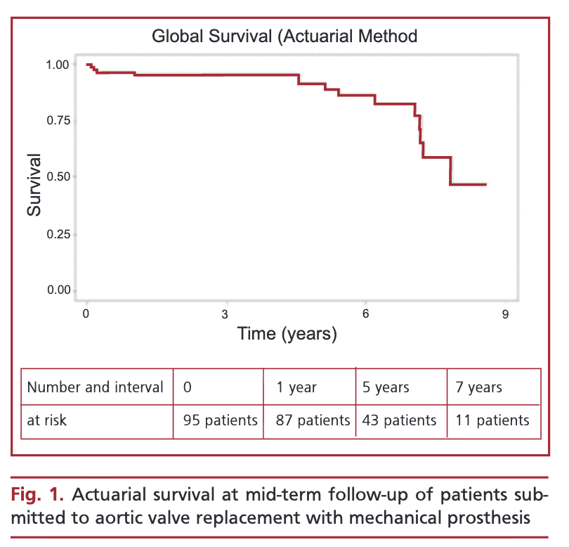 Se seleccionaron 95 pacientes sometidos a reemplazo valvular aórtico con prótesis mecánicas. Todos los pacientes fueron operados entre enero de 1999 y diciembre de 2006. La media de seguimiento fue de 4,5 ± 2,3 años, percentiles 25-75: 2,5-6,3 años. El seguimiento total fue de 427,5 pacientes/año.