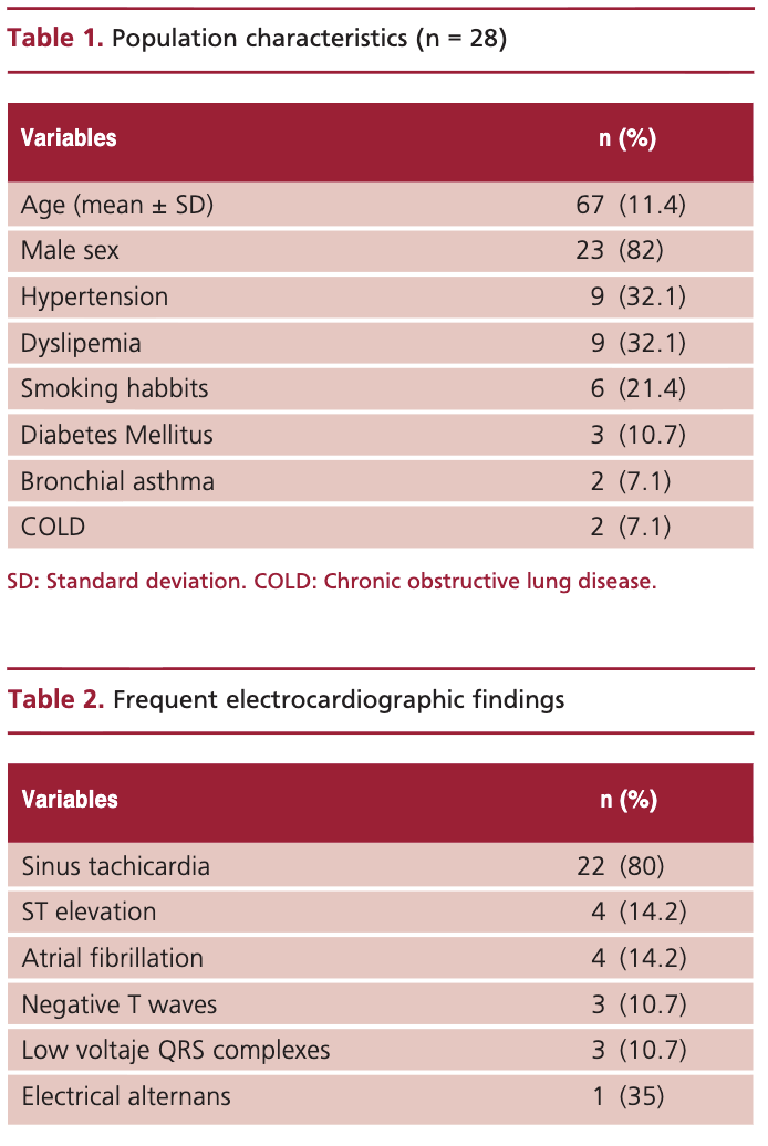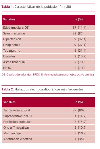 La edad media fue de 67 ± 11 años, el 82% eran hombres, 25 (89,3%) se encontraban sintomáticos por disnea, 4 (16%) con taponamiento cardíaco y 10 (35,7%) con signos ecocardiográficos incipientes de taponamiento. El seguimiento promedio fue de 60 meses (3-128 meses). Los 3 pacientes asintomáticos no fueron drenados y tuvieron una evolución favorable (seguidos en promedio durante 42 meses). Los 25 pacientes sintomáticos se trataron con drenaje pericárdico y se realizó seguimiento en 23 (2 perdidos). En 14 (60,8%) de ellos no hubo recidiva de derrame, 3 (13%) presentaron derrame leve, 2 (8,6%) derrame moderado y 4 (17,2%) derrame severo. De estos últimos, 3 estaban con disnea III-IV, por lo que requirieron pericardiectomía, con buena evolución ulterior. El paciente restante permaneció asintomático.