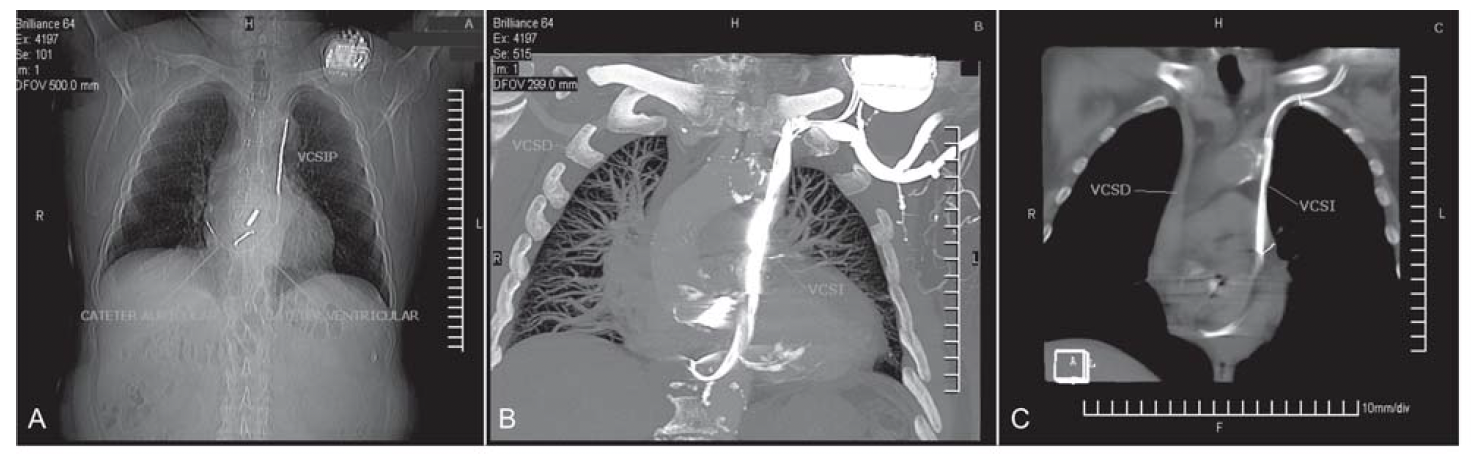 La vena cava superior izquierda persistente (VCSIP) es la anomalía congénita venosa del tórax más frecuente. Se encuentra en el 0,3% de la población general y en el 5-10% de los pacientes con cardiopatías congénitas. Generalmente evoluciona en forma asintomática y no genera trastornos hemodinámicos, pero su reconocimiento es importante, ya que puede dificultar la introducción de catéteres para mediciones hemodinámicas, los implantes de marcapasos cardíacos (MCP) y de cardiodesfibriladores automáticos implantables (CDAI), especialmente cuando se utiliza la vía cefálica o la subclavia izquierda. En el caso clínico que se presenta se efectuó el implante de un CDAI bicameral vía VCSIP, descubierta durante el procedimiento. Asimismo, se muestran las características de esta variedad anatómica mediante tomografía cardíaca computarizada de 64 cortes (TCC64).