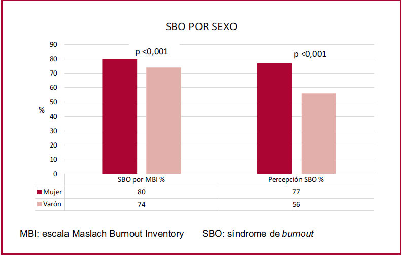 El SBO fue más prevalente en las mujeres que en los hombres, tanto por autopercepción (77% vs 56%, p<0,001) como por el inventario de Maslach (80% vs 74%, p=0,001), específicamente en la subescala...