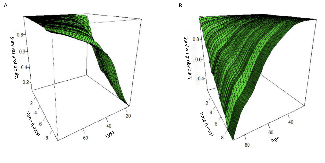 Resultados: Se evaluaron 603 pacientes, de los cuales 422 fueron asignados al grupo de derivación y 181 al de validación. Durante una mediana de 6,6 años de seguimiento, se observaron 63 muertes en el grupo derivación y 20 muertes en el grupo
