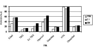 Se estudiaron 341 pacientes de ambos sexos con edad promedio de 70 ≤ 9,8 años que concurrieron entre julio de 1999 y julio de 2001 a la División Cardiología del Hospital Español. En todos los pacientes se identificaron los factores de riesgo aterogénicos (FRA) clásicos y la presencia de CI con evolución o no a EM. Paralelamente se realizó el examen odontológico. Se determinó el odds ratio (OR) para cada una de las variables, ajustado a sexo, edad y factores de riesgo compartidos. La prueba de significación se realizó en base a la prueba de chi cuadrado.