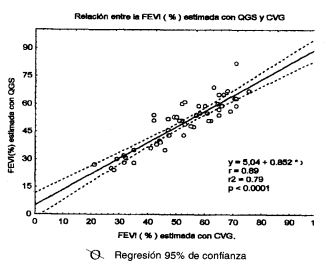 La FEVI (%) (-2,67±6,2, p < 0,05) fue menor que con CVG y el VFD (23,7 ± 36, p < 0,05) y el VFS (15,5 ± 25, p < 0,05) fueron mayores que los determinados con CVG . Se observo excelente correlacion entre la FEVI (%), el VFD (ml) y el VFS (ml) entre el QGS y la CVG (r = 0,89, r = 0,74 y r =0,85, respectivamente) . Entre el QGS y la CVG se observo buena concordancia para estimar la