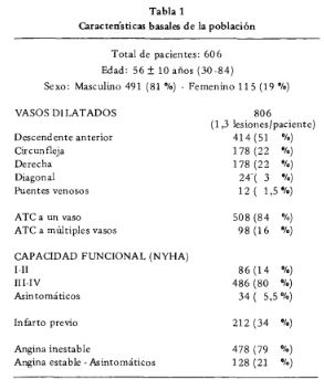 Entre enero de 1985 y diciembre de 1988 se efectuó angioplastia trans luminal coronaria a 606 pacientes consecutivos. EI 79 % tenía angina inestable y el 80 % presentaba síntomas severos. EI éxito primario fue del 91 %, la mortalidad hospitalaria 0,8 % Y el infarto asociado al procedimiento 1,7 %. En un seguimiento a dos años la sobrevida fue del 97,7 % Y la sobrevida Ilbre de eventos mayores 88,7 %. EI 26 % volvió a presentar angina típica, un 66 % debido a reestenosis. Se observó una clara relación entre el momento de reaparición de los síntomas 0 la isquemia luego de la angioplastia y la causa de la misma: durante el primer mes se debió a revascularización incompleta, entre el primero y tercer mes a reestenosis y después de los seis meses a progresión de la enfermedad coronaria. La mitad de 105 pacientes con reestenosis se presentó en clase funcional III-IV, mientras que la mayoría de aquellos con revascularización incompleta o con progresión de la enfermedad coronaria se presentó en clase I-II (86 % Y 75 % respectiva- mente). Los resultados de la angioplastia en nuestro medio, en pacientes seleccionados parecen favorables, con un alto éxito primario y una buena sobrevida a dos años, debiendo considerarse la posibilidad de una nueva angioplastia en algo más del 20 % de los pacientes en los primeros meses.