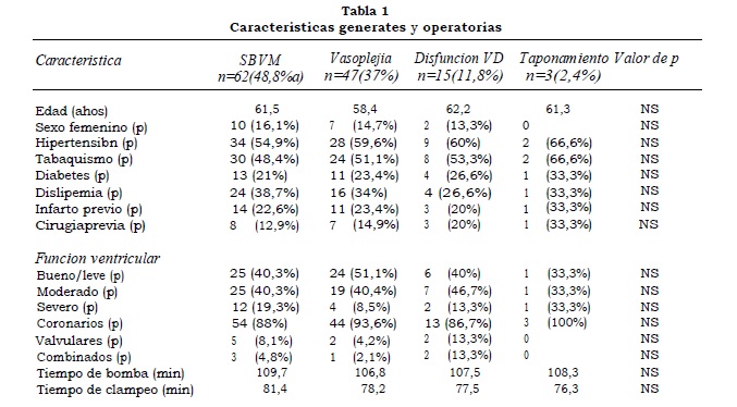 Material y métodos. Se incluyeron las cirugías efectuadas en los centros participantes entre el 1° de enero de 1999 y el 1° de diciembre de 2001. Los pacientes que presentaron inestabilidad hemodinámica temprana constituyeron la población en estudio. Se excluyeron los pacientes con hipotensión en el curso de arritmias o sangrado activo o hipovolémicos. Se establecieron los patrones hemodinámicos de bajo volumen minuto, síndrome vasopléjico, disfunción ventricular derecha y taponamiento cardíaco. Se consideró significativo un valor de p < 0,05.