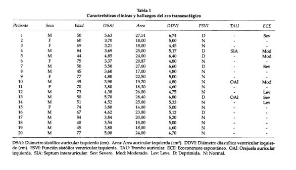 De los 20 pacientes ingresados, se halló un trombo en la aurícula izquierda en 3 pacientes (15%) (septum interauricular en 1 paciente, orejuela en 2 pacientes) y ecocontraste espontáneo en 8 pacientes (40%) . El ecocontraste espontáneo fue moderado a severo en 6 pacientes (75%) y leve en los otros 2 (25%) . De los pacientes con trombo auricular, dos (66,6%) tenían depresión de la función sistólica ventricular izquierda y dilatación auricular izquierda, mientras que en el pa- ciente restante ambos parámetros eran normales . En cuanto al ecocontraste espontáneo, 5 pacientes (62,5%) presentaban disminución de la función sistólica ventricular izquierda y 7 (87,5%), dilatación auricular. La depresión de la función ventricular fue significativamente más frecuente en los pacientes con ecocontraste espontáneo (p < 0,005) .