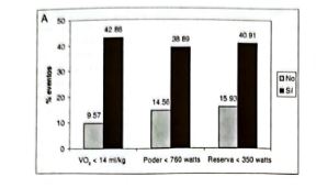 Población: 157 pacientes, hombres 83,4%, edad 59 ± 10 años, clase funcional III/IV 22,2%, deterioro severo del VI 56,7%, eventos: 22,9%. Seguimiento promedio: 9 meses. Los pacientes con eventos presentaron menores valores de: VO2max, (11,8 versus 14,9 ml/kg/min, p<0,001), PCmax (831 versus 1.079 watts, p=0,002).