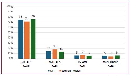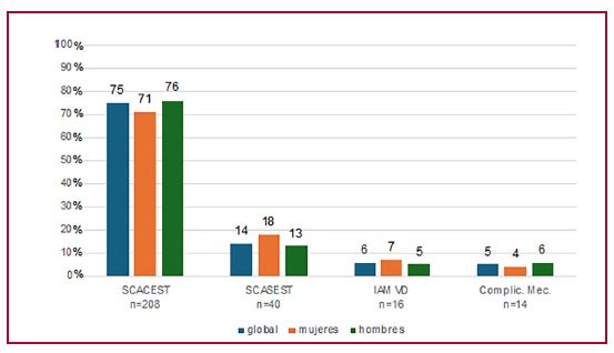 Conclusiones: Las mujeres con SC por IAM son más añosas que los hombres y reciben similar tratamiento, excepto soportes mecánicos, más utilizados en hombres. No encontramos diferencias significativas de acuerdo con el sexo en la mortalidad, que fue elevada en ambos grupos.
