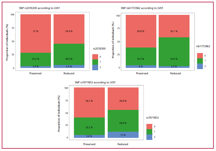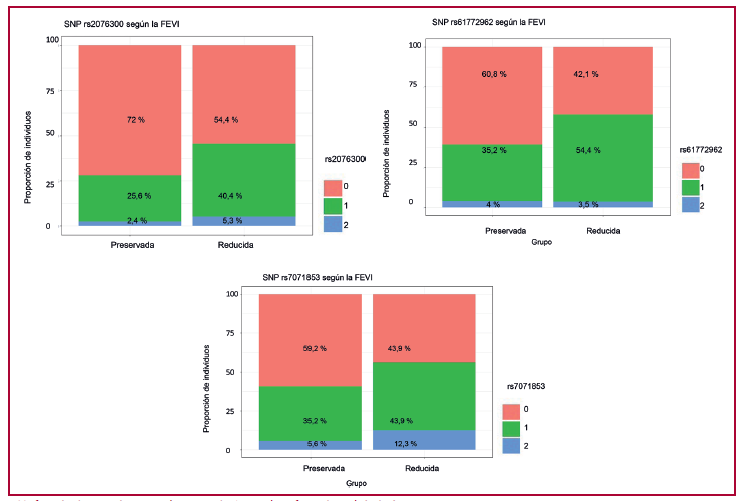 Resultados: Se incluyeron 182 pacientes, con una mediana de edad de 62 años, el 39,6 % hombres. El 31 % presentó FEVIr y el 53 % algún TCIV. El modelo con el mejor desempeño fue la regresión logística (F1 = 0,85), por lo que se la utilizó para expresar la asociación mediante el Odds Ratio y su IC del 95%. Se observó que las variantes rs2076300, rs61772962 y rs7071853 fueron predictores independientes de reducción de la FEVI. Mientras que, para la presencia de TIVC, el único predictor fue el SNP rs72840788. El SNIP rs61772962 corresponde al gen PRKAA2, que codifica a la subunidad catalítica alfa-2 de la proteína quinasa activada por 5’-AMP. Por su parte el rs7071853 y el rs72840788 corresponden al gen que codifica a la proteína BAG3 (regulador 3 de chaperona). Finalmente el SNP rs2076300 corresponde al gen DSP que codifica una desmoplaquina, proteína de la placa de unión de los desmosomas.