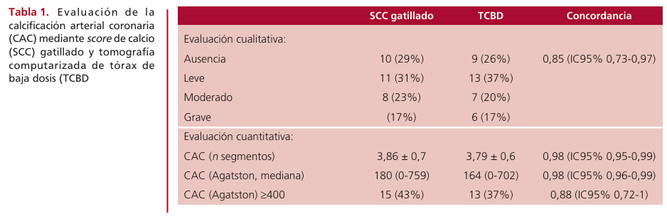 Resultados: Identificamos una buena concordancia entre los métodos tanto en su valoración cualitativa como cuantitativa, con una media de 3,86 ± 0,7 segmentos con calcificaciones arteriales coronarias mediante SCC gatillado, comparado con 3,79 ± 0,6 segmentos mediante TC de tórax no gatillada de baja dosis (coeficiente de correlación de concordancia 0,98 [IC 95% 0,95-0,99]) y una subestimación del SCC evaluado mediante unidades Agatston del 9,8 %.