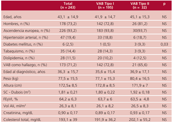 Resultados: Se incluyeron 243 pacientes (43 ± 14,9 años, 73,2% hombres). La mayoría (n = 194, 79,8%) con VAB tipo I y rafe (n = 179; 73,6%). En el ecocardiograma basal, 111 pacientes presentaban IAO leve (45,6%); 49, moderada (20,1%); y 10, grave (4,1%). La EAO basal fue menos frecuente: 20 sujetos tuvieron EAO moderada (8,2%) y 12, EAO grave (4,9%). Hubo 2 muertes y 20 cirugías valvulares (8,2%) en 4,7 ± 1,7 años de seguimiento. Los pacientes con disfunción valvular significativa basal presentaron mayor tasa de progresión y requerimiento de cirugía valvular (p < 0,0001). Hubo 39 nuevos casos (17,2%) de IAO o EAO significativas en el seguimiento. El prolapso valvular aórtico(p < 0,001) y el sexo masculino (p < 0,04) se asociaron al desarrollo de IAO significativa (p < 0,001). El score de calcificación basal se asoció con EAO significativa (p < 0,02).
