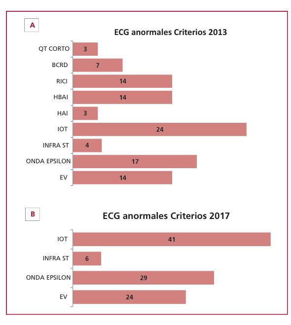 Conclusiones: De los electrocardiogramas considerados anormales según los criterios 2013, el 41,4% pasó a considerarse normal al aplicarse los criterios redefinidos en 2017. Ni el género ni la edad constituyen variables predictoras independientes. En ningún evaluado, se pudo demostrar cardiopatía en el seguimiento.